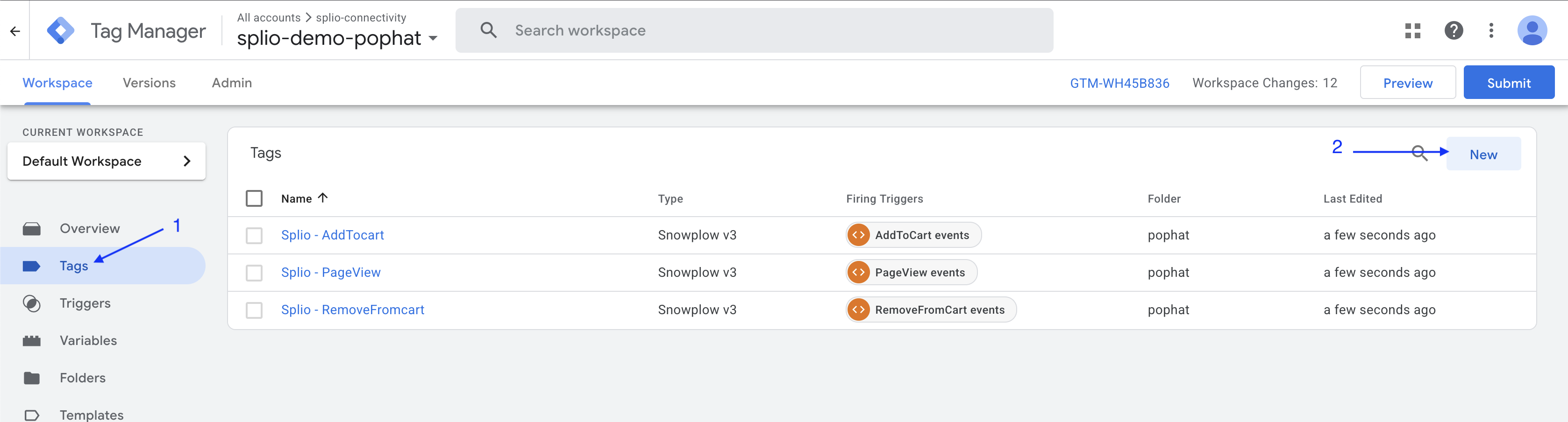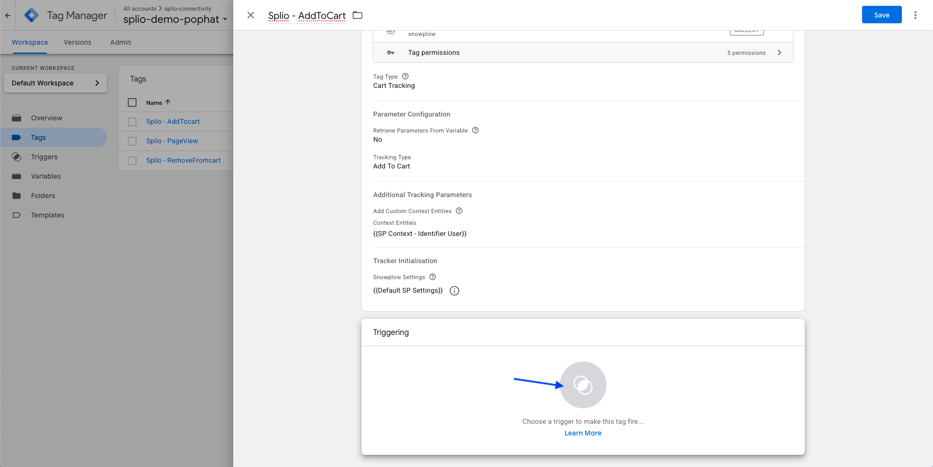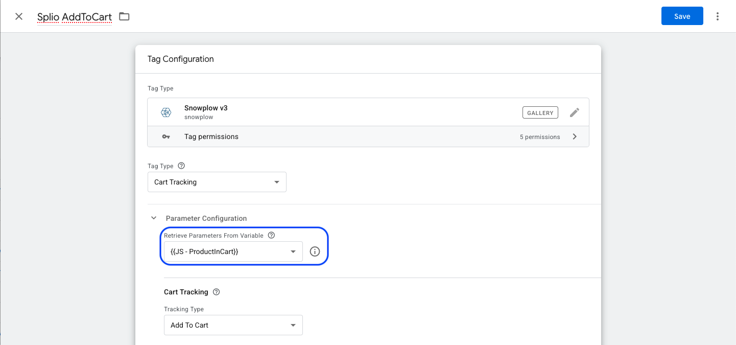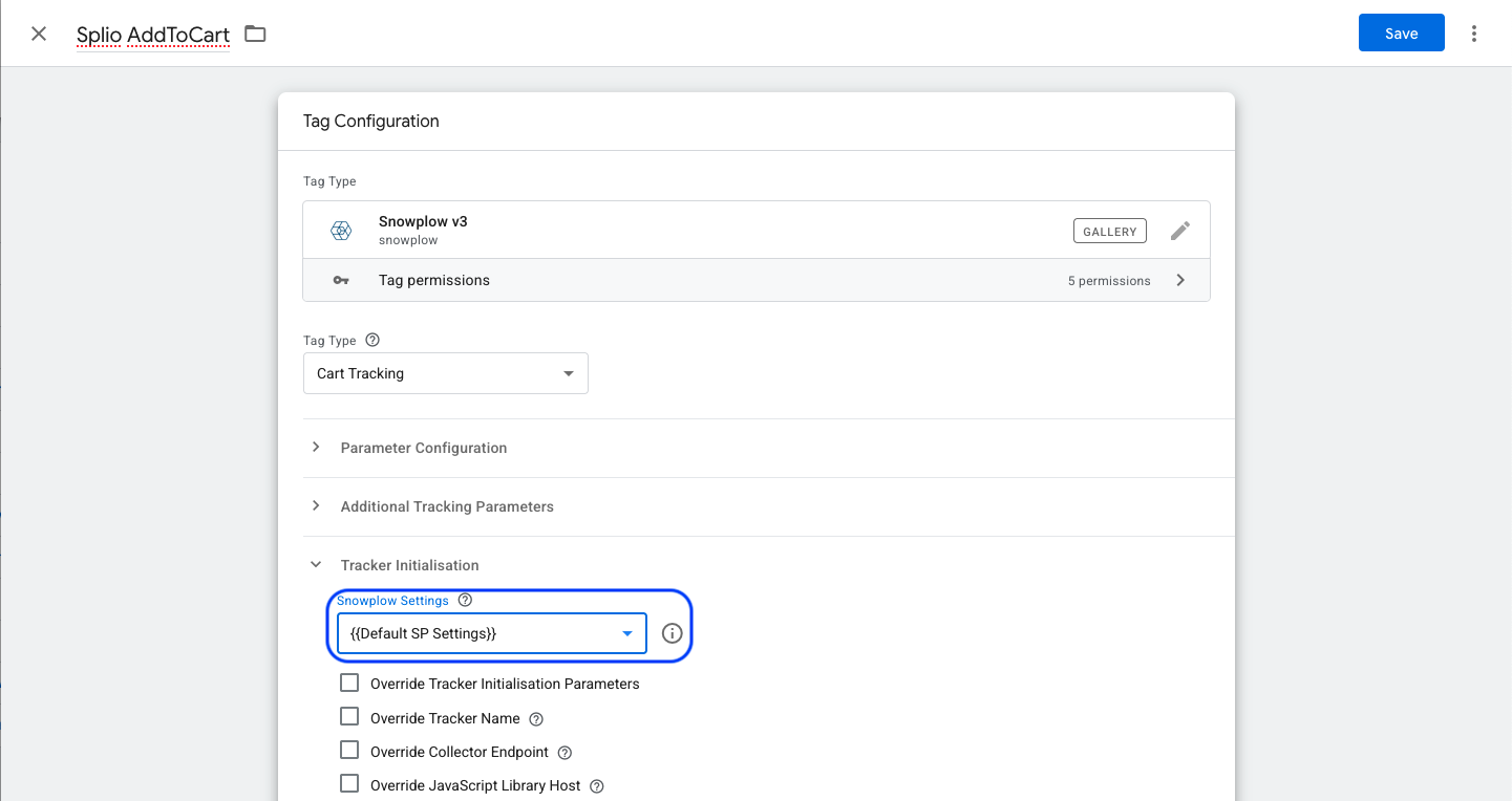 Tracker Initialisationsection, choose the Snowplow Settings variable previously defined ({{Default SP Settings}})