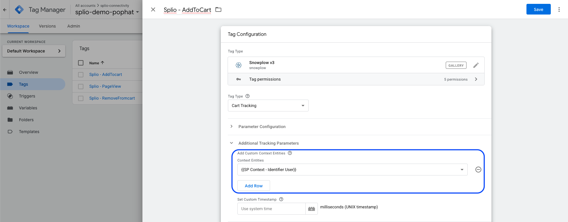 Additional Tracking Parameterssection, you'll need to add{{SP Context - Identified User}}context to theCustom Context Entities