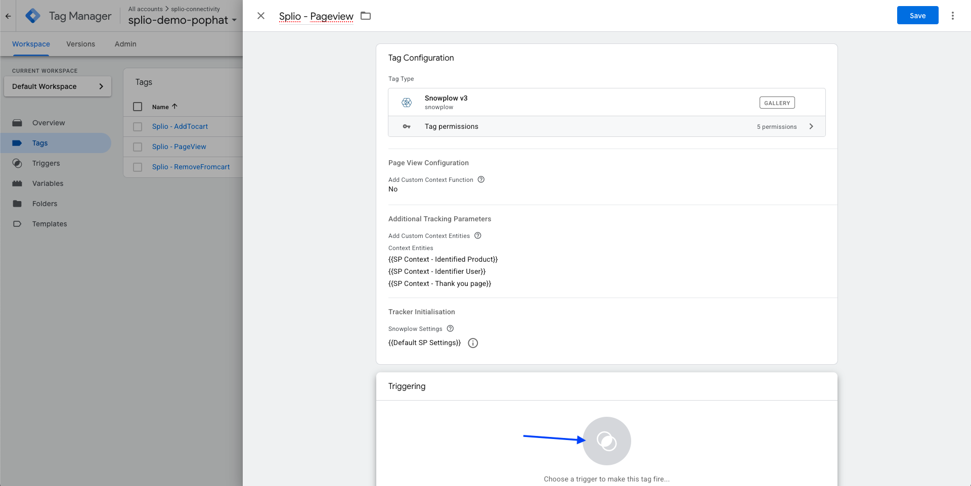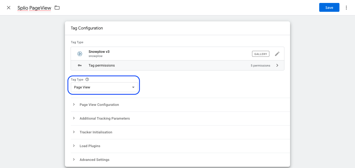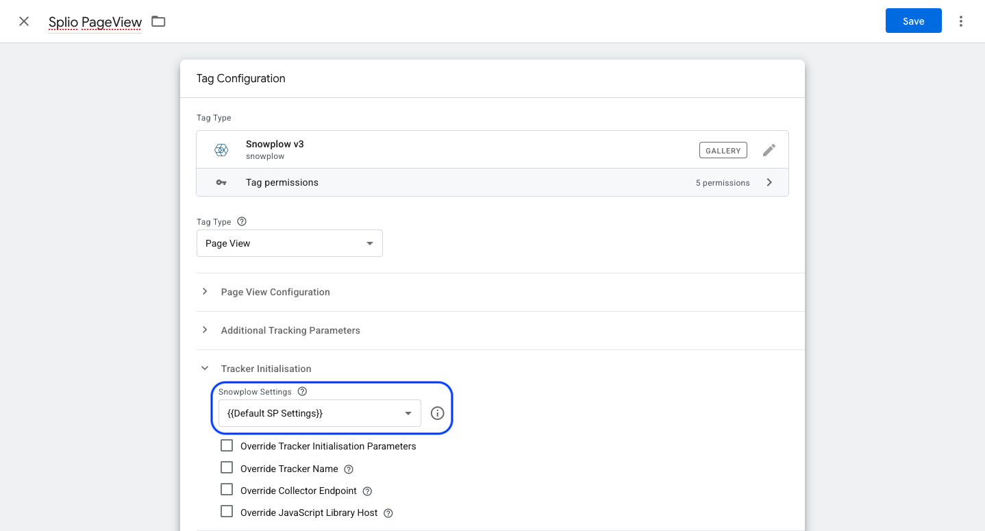 Tracker Initialisationsection, choose the Snowplow Settings variable previously defined ({{Default SP Settings}})