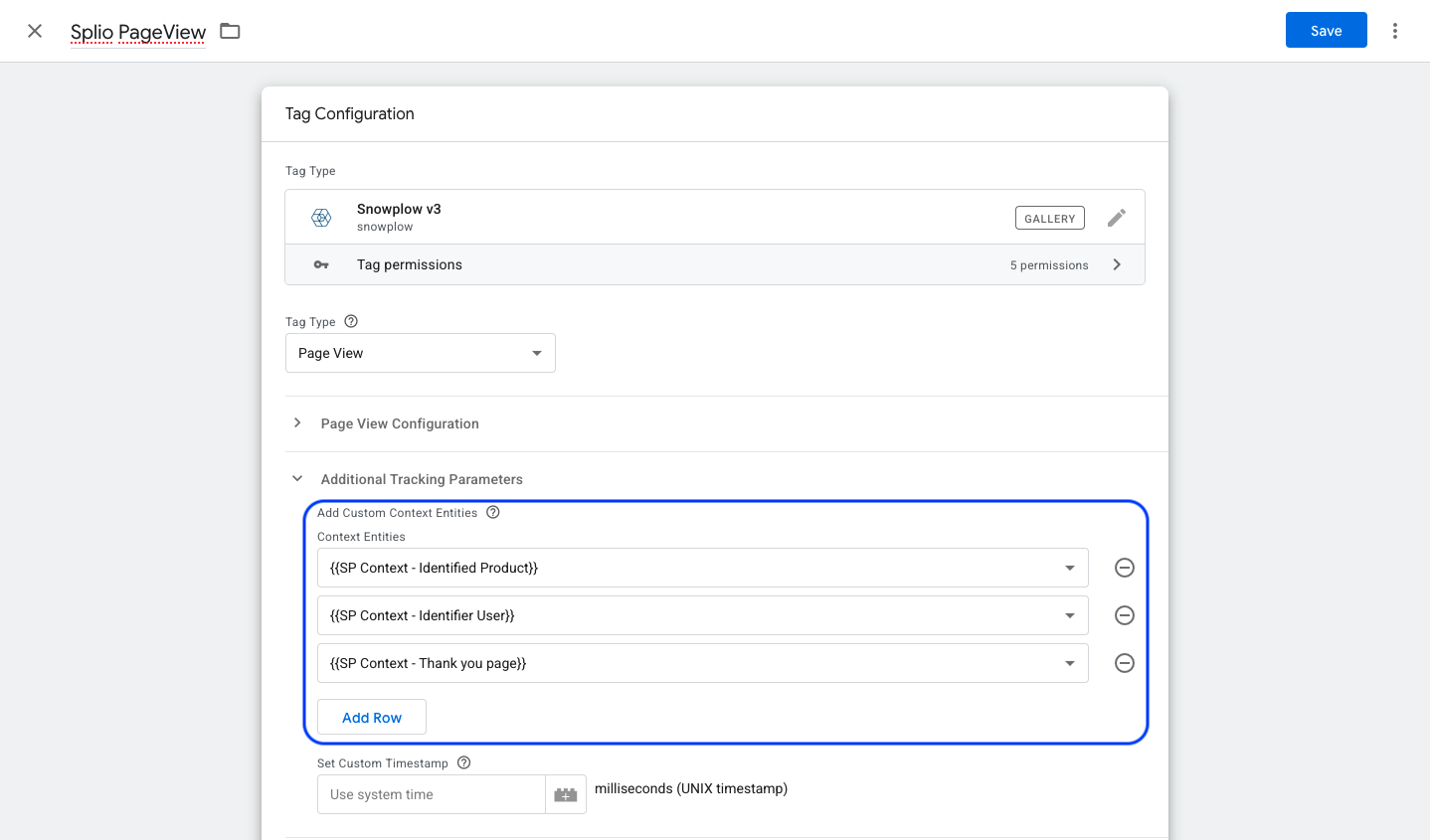 Additional Tracking Parameterssection, you'll need to add the followingCustom Context Entities:Parameter Purpose {{SP Context - Identified Product}}Used by the Splio Collector to detect the Product View {{SP Context - Identified User}}Context used to identified authenticated users {{SP Context - Thank you page}}:Used by the Splio Collector to detect the navigation to a purchase confirmation page