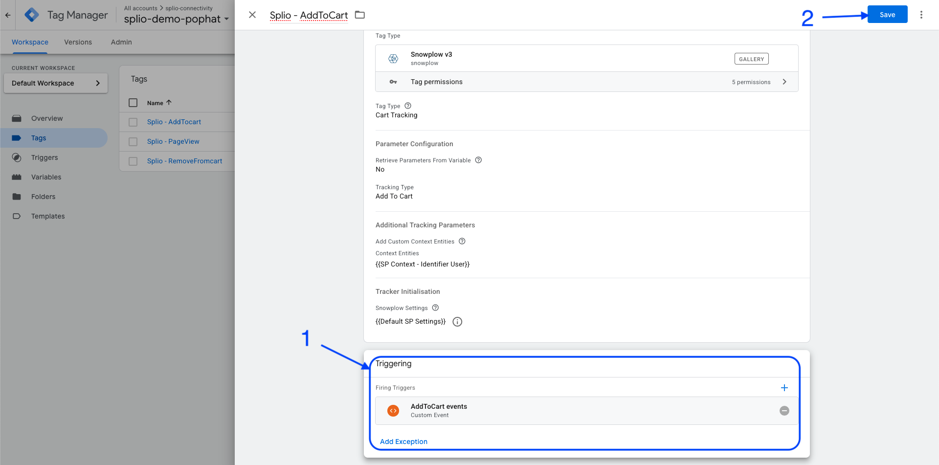 The new trigger will be automatically selected in the tag configuration page (1). Then click on save (2)