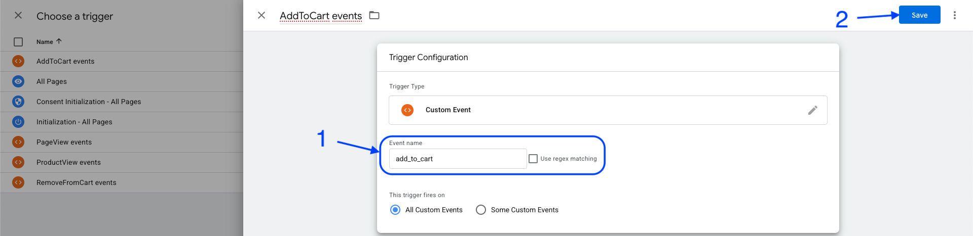 Fill in the event name (1) then save (2) the trigger.