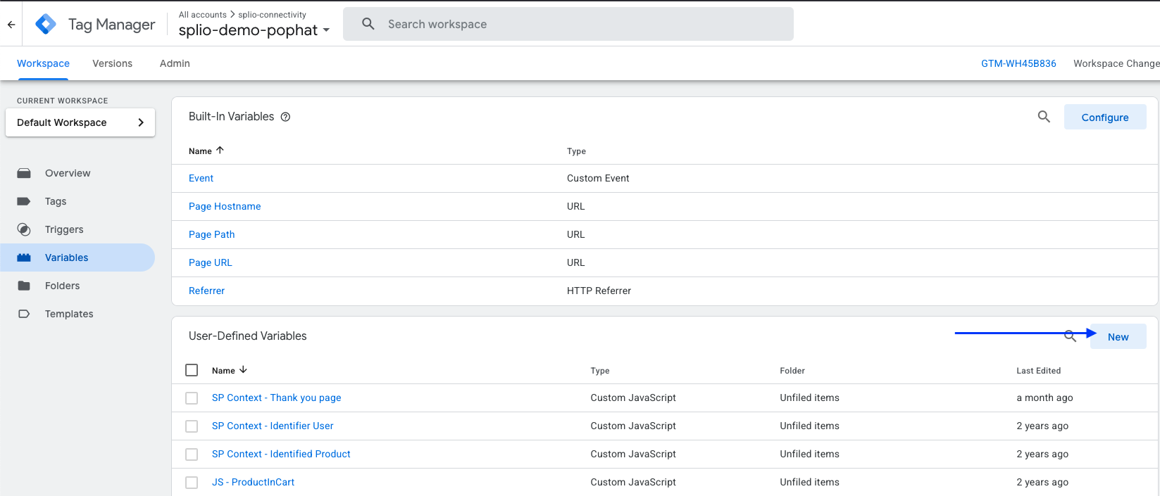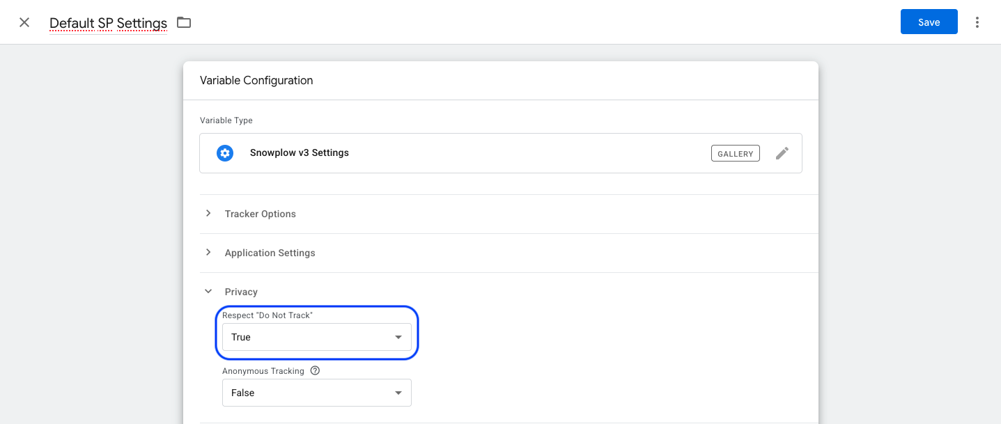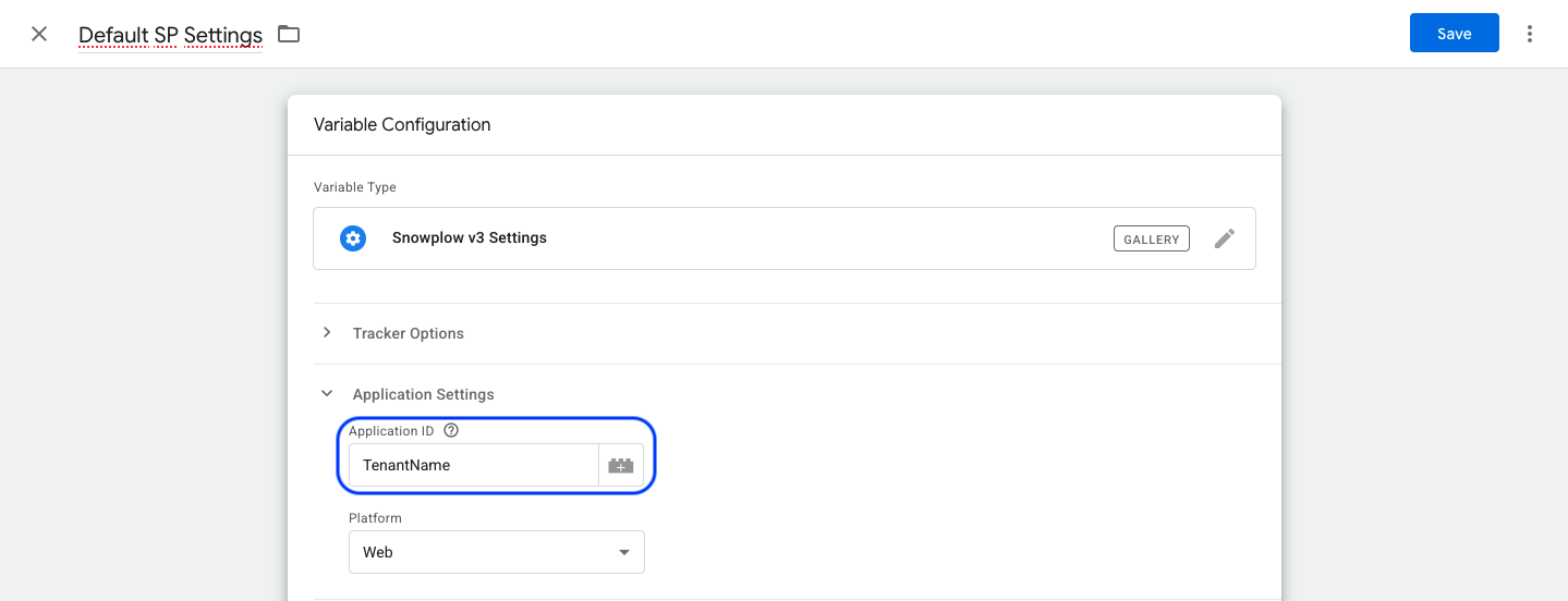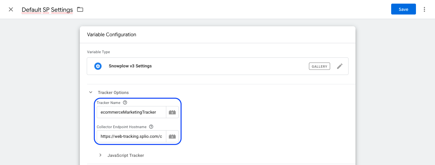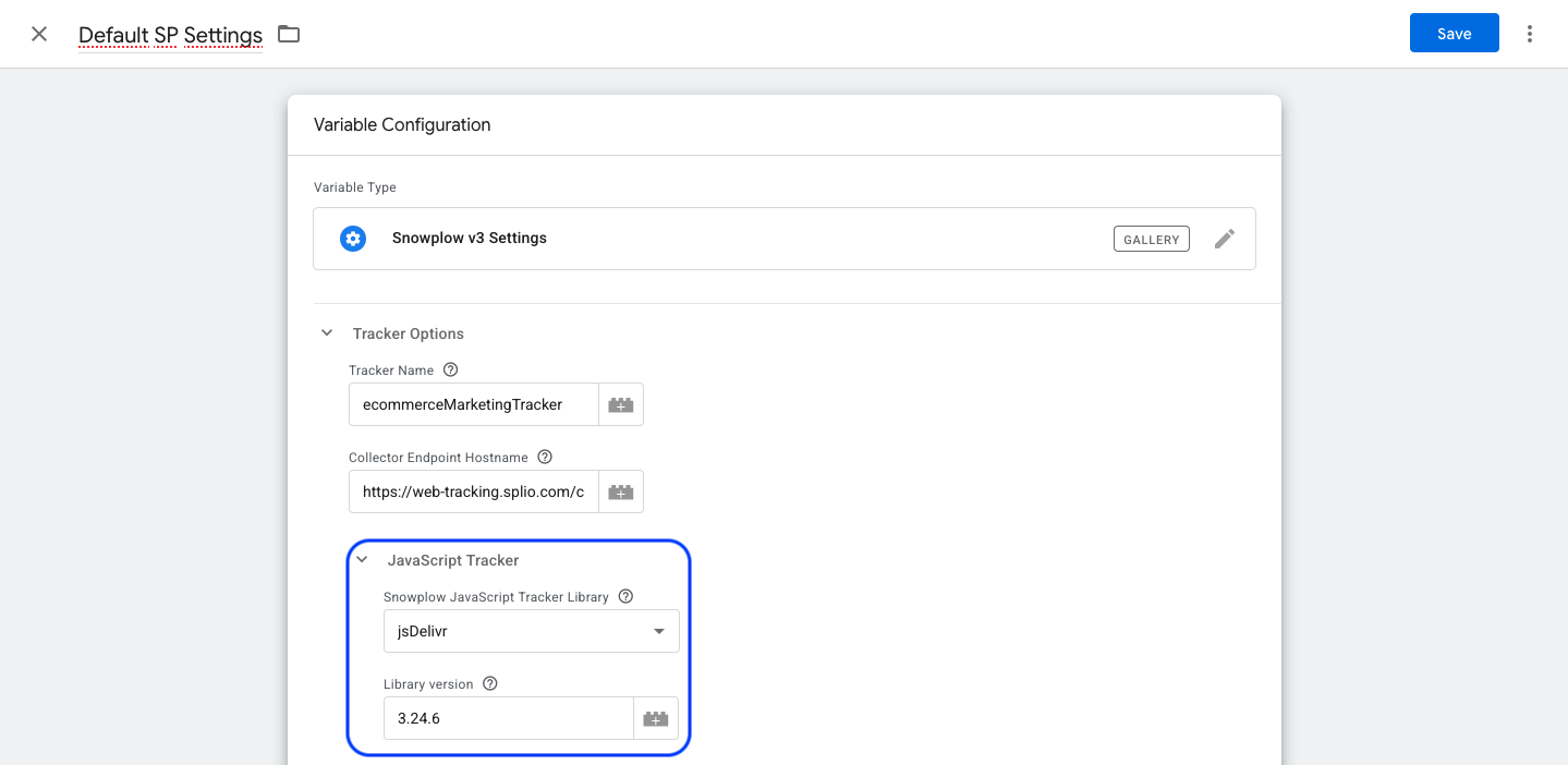 All the parameters needed for the tracker to communicate with Splio web tracking collector are stored in a Snowplow v3 Settings variable.