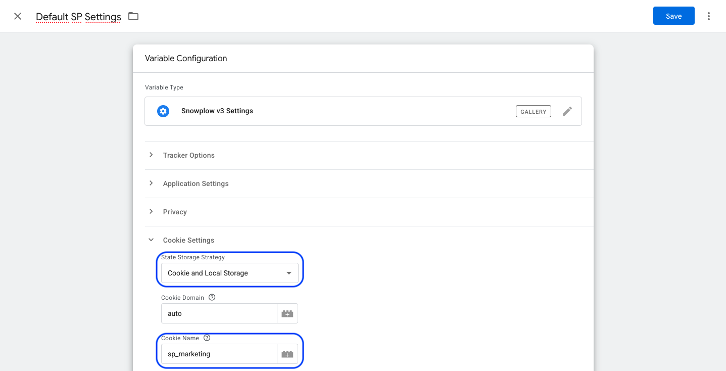 Cookie Settingssection, you can change the following settings as follow:State Storage Strategy: Use a “Cookie and Local Storage” strategy. Note that it will be a first party cookieCookie Name: Adapt the default cookie Name to your preferences. For examplesp_marketing